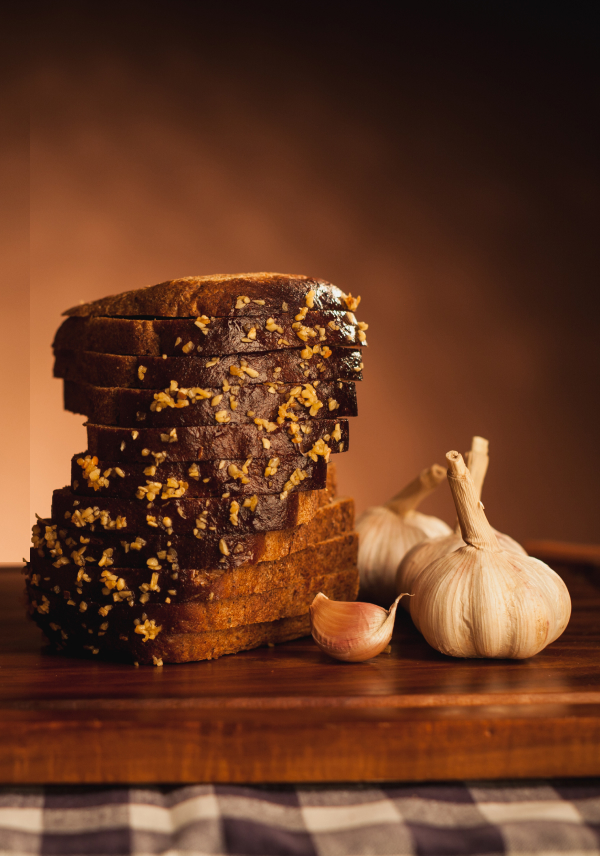 Насыщенный по вкусу за счет чеснока, который идет на отделку этого хлеба.