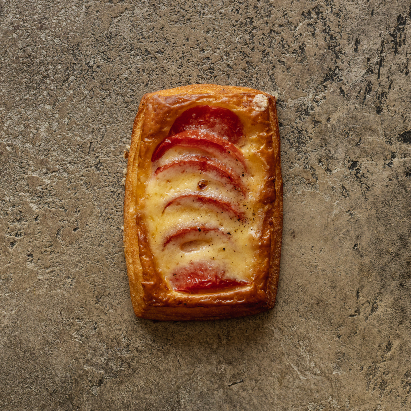 Томаты свежие, мука пшеничная в/с, сыр полутвердый Тильзитер с массовой долей жира 45%, масло сливочное, молоко, сахар белый, яйцо куриное, вода, мука пшеничная цельнозерновая, дрожжи прессованные, перец черный горошек, соль поваренная пищевая.
